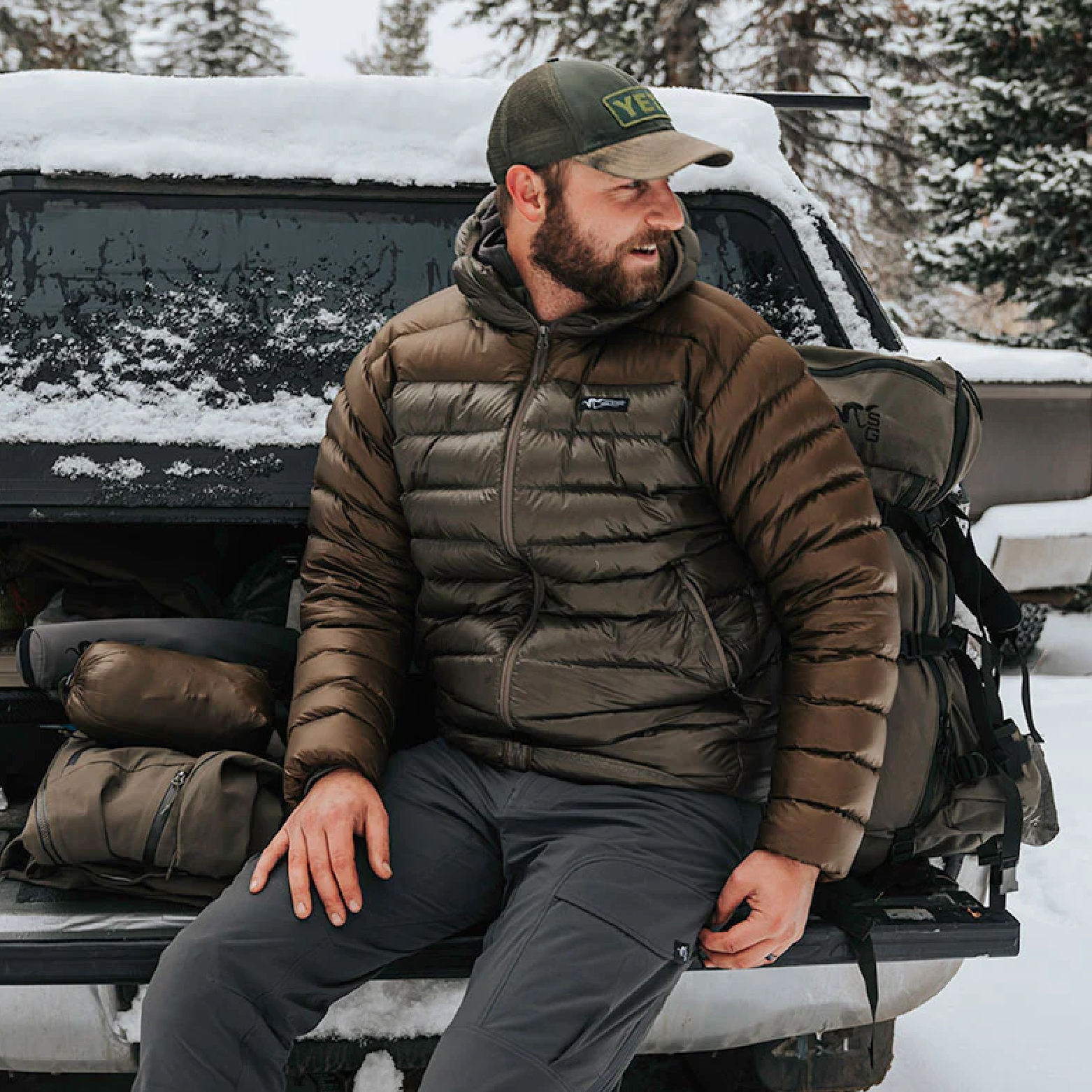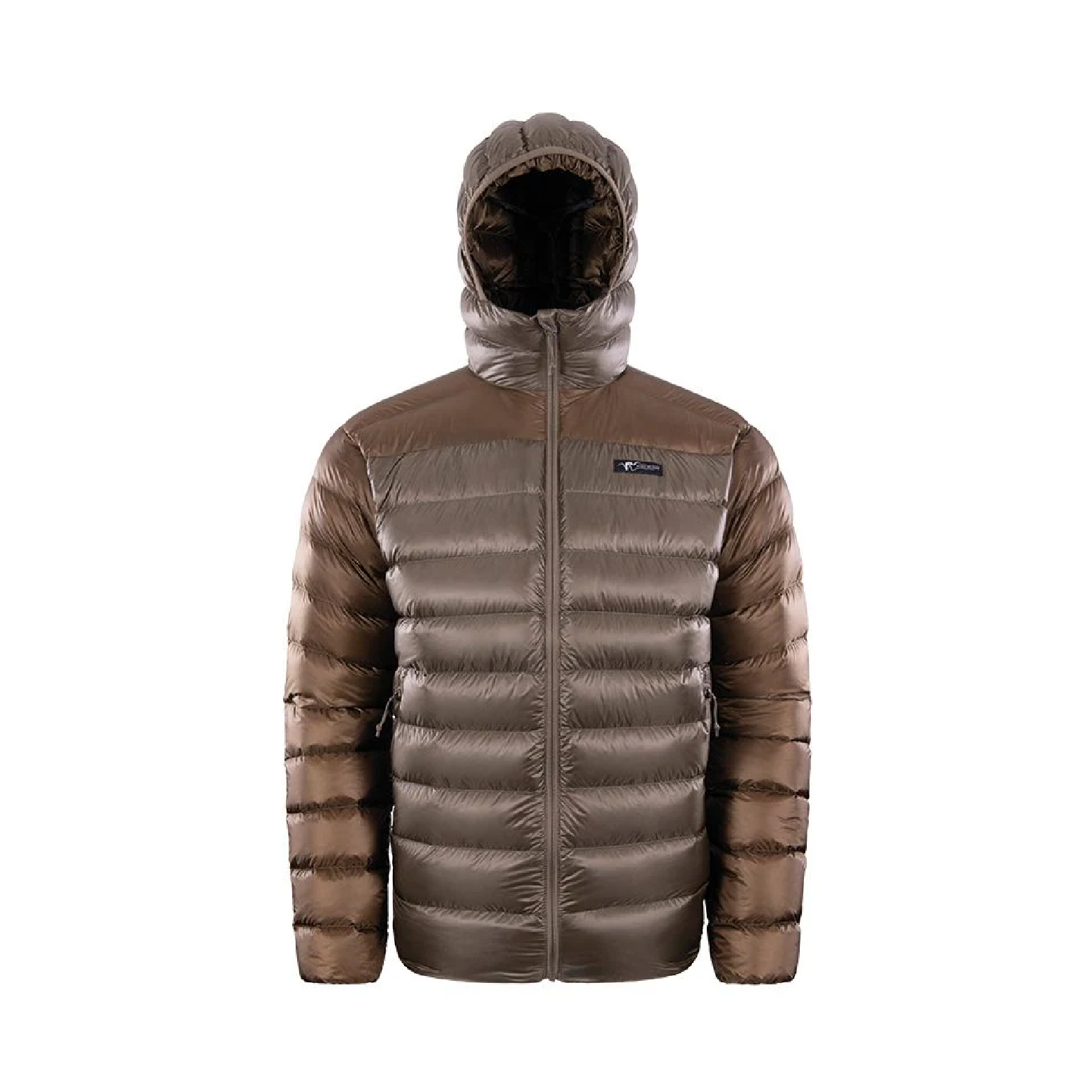 Ultralight and packable down insulation worn as an outer layer during static activity while hunting in cold conditions or layered underneath a shell in extremely cold, wet conditions.